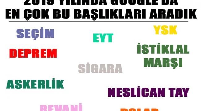 Medya takip kurumu Ajans Press,2019 Google Arama Trend’leri araştırmasını inceledi. Ajans Press’in derlediği bilgilere göre, 2019 yılı içerisinde en fazla İstanbul Seçim Sonuçları başlığında arama yapıldığı görüldü. İkinci sırada “Geleceğe Nefes” projesi yer alırken en fazla arama yapılan üçüncü başlık ise “YSK” oldu. En fazla arama yapılan diğer başlıklar ise sırasıyla, “Deprem”, “Sigara Fiyatları”, “Dolar Kuru”, “Askerlik Son Dakika”, “EYT”, “İstiklal Marşı 10 Kıta” ve “Notre Dame Katedrali” oldu.