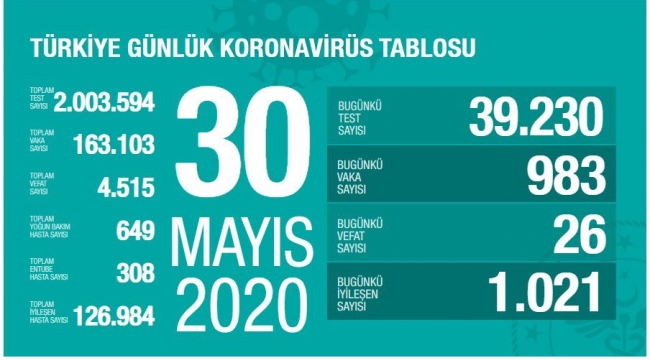 Bakan Koca'nın açıkladığı son verilere göre Türkiye'de can kaybı 26 artarak 4 bin 515 oldu. Yapılan 39 bin 230 testte 983 yeni vaka tespit edildi. Son 24 saatte bin 21 kişi iyileşti.Toplam test sayısı 2 milyonu geçti.