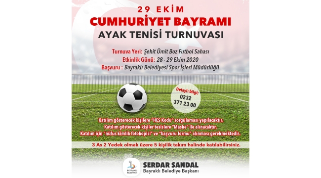 EGEOLAY/Bayraklı Belediyesi Spor İşleri Müdürlüğü, 29 Ekim Cumhuriyet Bayramı dolayısıyla Ayak Tenisi Turnuvası düzenliyor. Dereceye girenlerin ödüllendirileceği ücretsiz etkinliğe, isteyen herkes 5'er kişilik kadrolarıyla katılabilecek.