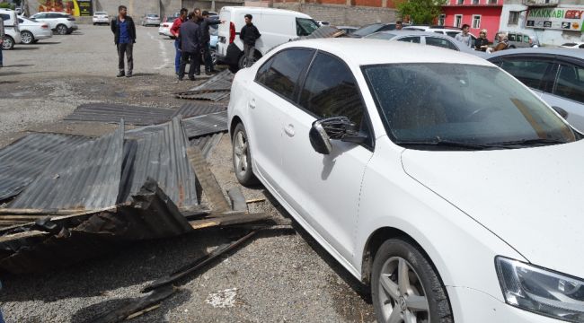 Ağrı'da aniden bastıran yağış ve şiddetli rüzgar nedeniyle evlerin çatıları uçtu. Uçan çatıların parçaları arabaların üzerine düştü.