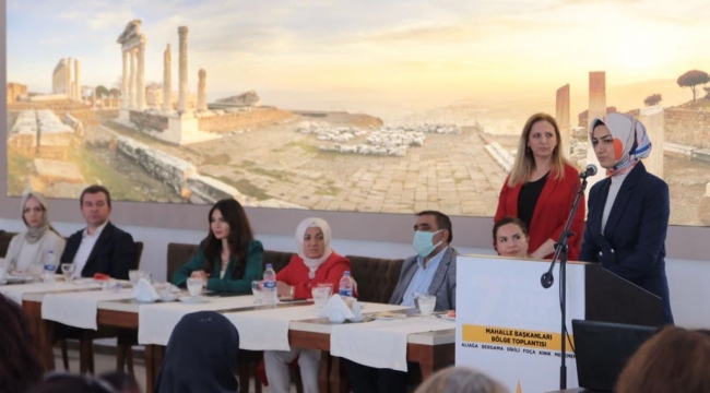 AK Parti İzmir İl Kadın Kolları Başkanlığının düzenlediği, Mahalle Başkanları Bölge toplantısının ikincisi; Aliağa, Bergama, Dikili, Foça, Kınık ve Menemen ilçelerinin katılımıyla Bergama’da yapıldı. Toplantıya; Genel Merkez Kadın Kolları MKYK üyesi ve İzmir Koordinatörü Dora Kübra Yıldız, AK Parti İzmir İl Kadın Kolları Başkanı Dilek Yıldız Büyükdağ, Bergama Belediye Başkanı Hakan Koştu, Kınık Belediye Başkanı Sadık Doğruer, Bergama İlçe Başkanı Sebahattin Güzel ile İlçe Kadın Kolları Başkanları ve Kadın Kolları Mahalle Başkanları katıldı. Programın sonunda AK Parti İzmir İl Kadın Kolları Arge ve Eğitim Başkanı Saadet Doğru ise Kadın Kolları Mahalle Başkanlarına Teşkilat İçi eğitim semineri düzenledi.