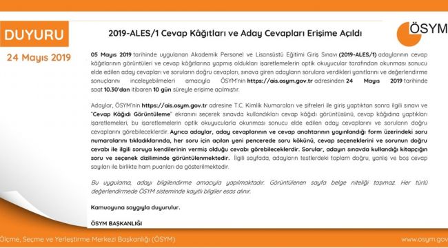 5 Mayıs'ta yapılan ALES'in sonuçları ve adayların cevap kağıtları yayımlandı. Sınava giren adaylar, soruların doğru cevaplarını, verdikleri yanıtları ve değerlendirme sonuçlarını ÖSYM'nin aday işlemleri sayfasından T.C. kimlik numaraları ve aday şifreleriyle giriş yaparak öğrenebilecek.