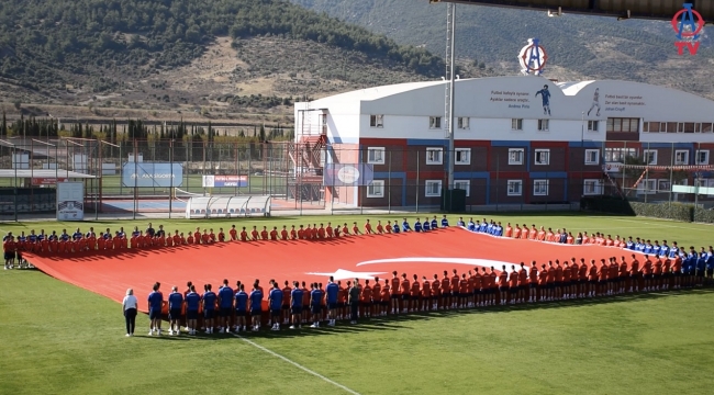Serpil Hamdi Tüzün sahası zeminine açılan dev Türk Bayrağı’nın etrafında toplanan Altınordu Kulübü’nün sporcuları ve çalışanlarımız bir dakikalık saygı duruşunun ardından büyük bir coşku ile İstiklal Marşı’nı okudu