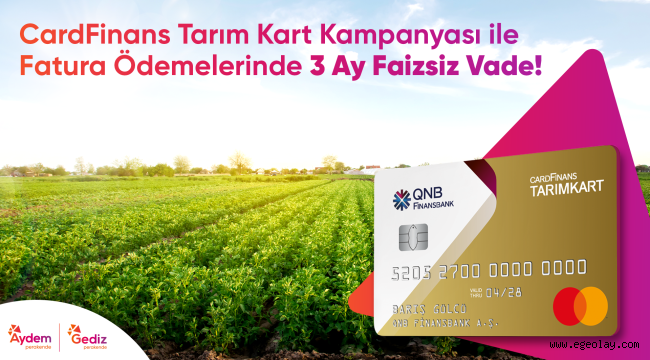 Bu fırsattan yararlanmak isteyen üreticiler, en yakın QNB Finansbank İşletme Bankacılığı Şubesine gelerek, Tarım Kart başvurusunda bulunabilecek. Üreticiler Tarım Kart kullanarak fatura ödemelerini Aydem Perakende ve Gediz Perakende Müşteri İlişkileri Merkezlerinde gerçekleştirebilecek.
