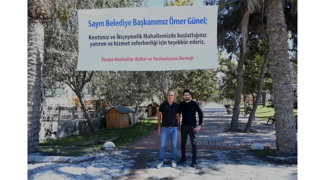 EGEOLAY/Konya Hadimliler Kültür ve Yardımlaşma Derneği yönetimi, İkiçeşmelik Mahallesi’nde başlatılan alt ve üst yapıyı yenileme çalışmaları nedeniyle bir pankart hazırlatarak Kuşadası Belediye Başkanı Ömer Günel’e teşekkür etti.