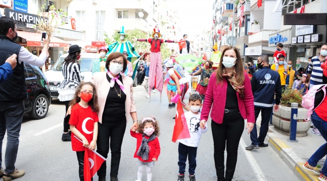 EGEOLAY/Ulu Önder Mustafa Kemal Atatürk’ün çocuklara armağan ettiği 23 Nisan Ulusal Egemenlik Çocuk Bayramı İzmir Balçova’da muhteşem bir coşkuyla kutlandı. Balçova Belediye Başkanı Fatma Çalkaya, masal kahramanı kıyafeti giyen bando takımı ve süslenen araçlarla sokak sokak gezerek çocukların bayramını kutladı.