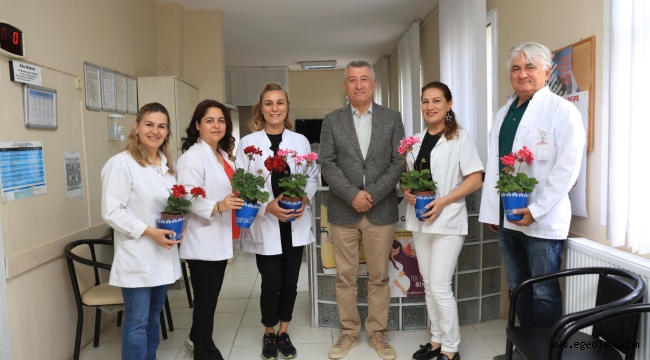 EGEOLAY/12 Mayıs Hemşireler Günü nedeniyle Güzelbahçe Belediye Başkanı Mustafa Günay, ilçedeki sağlık kuruluşlarını ziyaret etti, gününü kutlayıp birer sardunya çiçeği hediye etti.