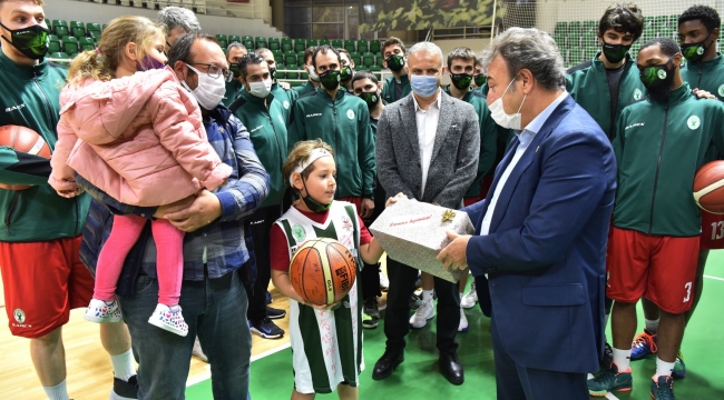 Koronavirüs pandemisinden önce seyirciye açık oynanan maçlarda takımı yalnız bırakmayan Atakan ve Ayda’ya imzalı forma ve basketbol topu hediye eden Başkan İduğ, “Atakan ve Ayda’yı ağırlamaktan memnuniyet duyduk. Bornova Belediyesi olarak her zaman iki yavrumuzun yanında olacağız” dedi.
