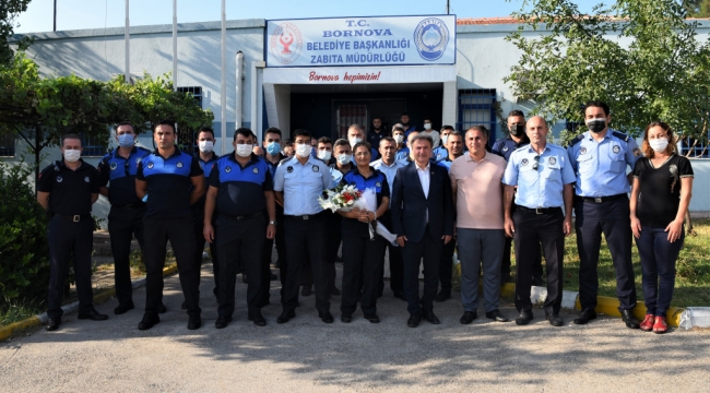 Bornova Belediyesi Başkan Yardımcıları Barbaros Taşer ve Emel Hülya Solak’ın da katıldığı ziyarette Zabıta Haftasını çiçek ve baklava ile kutlayan Başkan İduğ, zabıtalarla sohbet ederek yaptıkları çalışmalar hakkında da bilgi aldı. Çalışma esnasında yaşadıkları anılarını dinledi.