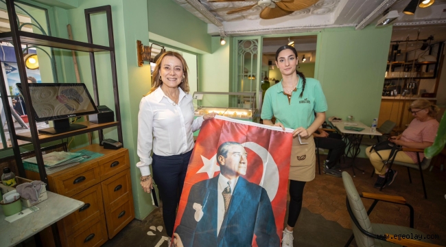 EGEOLAY/Konak’ta 19 Mayıs coşkusu, Başkan Mutlu’nun ilçe esnafına anlamlı hediyesiyle bir kat daha arttı. Alsancak’taki esnafı ziyaret eden Başkan Mutlu’nun hediye ettiği Atatürk baskılı bayraklar, dükkanları ve sokakları kırmızı beyaza bürüdü.