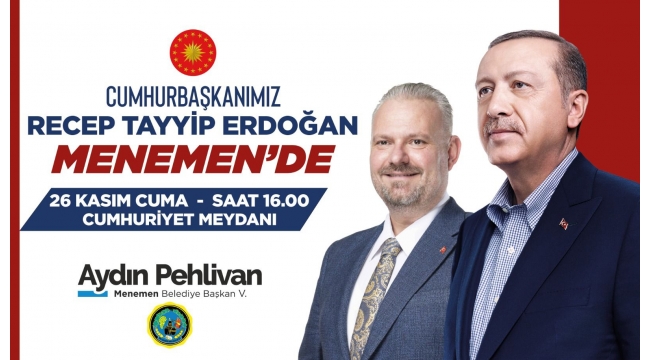 Cumhurbaşkanı Erdoğan'ın cuma günü saat 16.00'da Menemen Cumhuriyet Meydanı'nda düzenlenen mitingle halka sesleneceğini belirten Pehlivan, "Bu ziyaret, bizler için onur ve gurur kaynağıdır. Dünya lideri, Cumhurbaşkanımız Sayın Recep Tayyip Erdoğan, güzel İzmir’imize her gelişinde yaptığı yatırımlarla artı değer yaratırken verdiği müjdelerle de gelecek için umutlarımızı büyüttü. 26 Kasım Cuma günü saat 16.00'daki Menemen programı ile de biz Menemenlileri onurlandıracak" dedi.