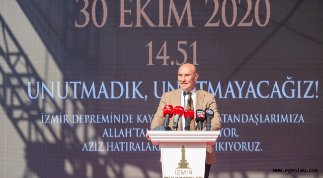 EGEOLAY/30 Ekim depreminde hayatını kaybeden 117 kişi İzmir’de düzenlenen iki ayrı törenle anıldı. İzmir Büyükşehir Belediyesi tarafından depremzedeler için Türkiye’de ilk kez İzmir’de hayata geçirilen Halk Konut projesinin ilk uygulaması olan Dilber Apartmanı’nın önündeki törende konuşan Başkan Tunç Soyer, “Dilber Apartmanı ile başlayan Halk Konut projesinin büyüdüğünü ve bu noktaya geldiğini görmek gurur verici. Mart ay içerisinde anahtarları teslim edeceğiz” dedi.