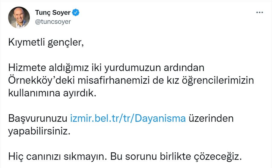 İzmir Büyükşehir Belediyesi, yurtların kapasitelerinin yetersizliği ve yükselen kira ücretleri nedeniyle barınma sorunuyla karşı karşıya kalan üniversite öğrencilerine yönelik çalışma başlattı. Başkan Tunç Soyer’in parklarda konaklamak zorunda kalan öğrencilerin durumlarını yakından takip ettiklerini belirterek, kampanyanın ilk işaretini vermişti. Kısa sürede hazırlıklarını tamamlayan İzmir Büyükşehir Belediyesi birimleri https://www.izmir.bel.tr/tr/ Dayanisma adresinden talepte bulunan öğrenciler ve destek vermek isteyenlerin başvurularını almaya başladı.