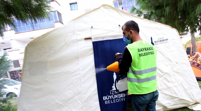 EGEOLAY/Bayraklı Belediyesi Koronavirüs önlemleri kapsamında depremin ilk gününden itibaren çadırları, ortak kullanım alanlarını, insanların yoğun olarak bulunduğu bölgeleri dezenfekte ederek, baştan sona temizliyor. Ekipler, çadırları tek tek gezerek, dezenfektan ve temizlik malzemeleri dağıtıyor.