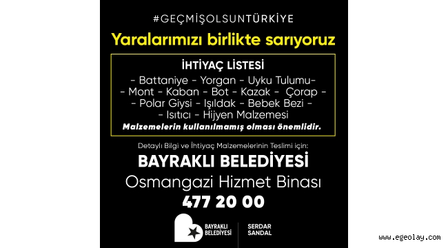 EGEOLAY/Kahramanmaraş merkezde meydana gelen ve 10 ilde yıkımlara, kayıplara neden olan 7,4 büyüklüğündeki deprem felaketinin ardından Bayraklı Belediyesi yardım kampanyası başlattı, kışlık kıyafet ve temel ihtiyaç malzemeleri çağrısında bulunuldu.