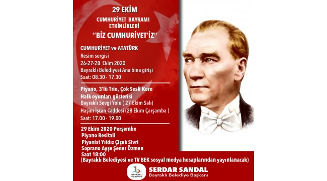 EGEOLAY/Bayraklı Belediyesi, 29 Ekim Cumhuriyet Bayramı'nın 97'nci yıl dönümüne özel program hazırladı. 3 farklı noktada gerçekleştirilecek etkinliklerde Cumhuriyet ve Atatürk konulu resim sergisi, müzik dinletileri, çok sesli koro konseri ve halk oyunları ekibinin gösterileri cumhuriyet coşkusuna renk katacak.