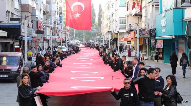 EGEOLAY/Ulu Önder Mustafa Kemal Atatürk, ebediyete irtihalinin 84’üncü yıl dönümünde Bayraklı’da da törenlerle anıldı. Saat 09.05’te hayat iki dakikalığına durdu. Sevgi Yolu’nda açılan 150 metrelik dev bayrak, duygu dolu anların yaşanmasına neden oldu.