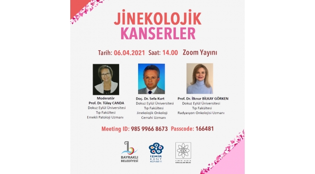 Halkın kanser ve kanserden korunma konusunda farkındalığını artırmak için her yıl 1-7 Nisan tarihleri arasında düzenlenen “Ulusal Kanser Haftası” etkinlikleri çerçevesinde internet üzerinden jinekolojik kanserler semineri düzenlenecek. Bayraklı Belediyesinin katkılarıyla İzmir Kadın Kuruluşları Birliği ve İzmir Kent Konseyi tarafından organize edilen etkinlik, Zoom programı üzerinden gerçekleştirilecek. Pataloji Uzmanı Prof. Dr. Tülay Canda Moderatörlüğündeki seminere; Jinekoloji Onkoloji Cerrahi Uzmanı Doç Dr. Sefa Kurt ve Radyasyon Onkolojisi Uzmanı Prof Dr. İlknur Bilkay Görken, konuşmacı olarak katılacak. 6 Nisan Salı gerçekleşecek seminer, saat 14:00’da başlayacak. Bayraklı Belediyesi Ar-Ge ile Kadın ve Aile Müdürlükleri tarafından katkı sağlanan organizasyona isteyen herkes ücretsiz katılabilecek. Seminerde, ergenlikten menepoz dönemine kadar ortaya çıkan kadın hastalıkları ile jinekolojik kanserler hakkında bilgiler aktarılacak.