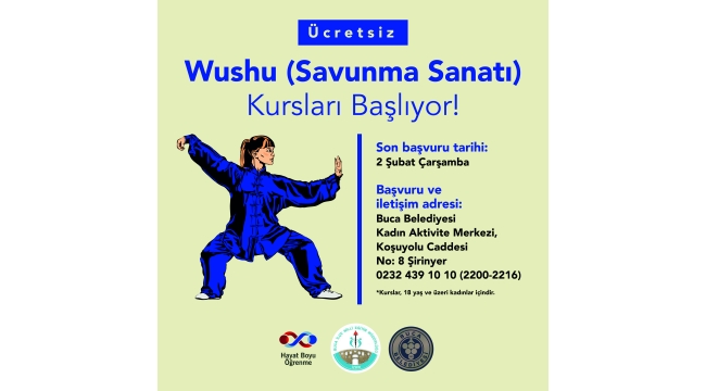 Kurslara 18 yaşından büyük Bucalılar katılabilecek. Son başvuru tarihi 2 Şubat Çarşamba günü olan wushu kurslarıyla ilgili detaylı bilgi almak isteyenlerin 439 10 10 (2200-2216) numaralı telefonu arayabileceği belirtildi.