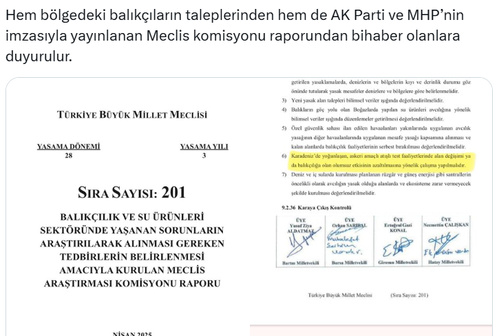 "Genel Başkanımız Sayın Özgür Özel’in Sinop’ta balıkçılık sezonu açılışında yaptığı açıklamaları, 'araştırmadan' saldıran iktidar kalemşörlerinin dikkatini çekmek isteriz: TBMM’de Balıkçılıkla İlgili Meclis Araştırma Komisyonu’nun raporu, AK Parti ve MHP dahil tüm partilerin imzasıyla yayınlandı. O raporda, 'Karadeniz’de yoğunlaşan askeri amaçlı atışlı test faaliyetlerinin balıkçılığa zarar verdiği, testlerin alanının değiştirilmesi ya da olumsuz etkilerinin azaltılması' istendi. Hem bölgedeki balıkçıların taleplerinden hem de AK Parti ve MHP’nin imzasıyla yayınlanan Meclis komisyonu raporundan bihaber olanlara duyurulur."