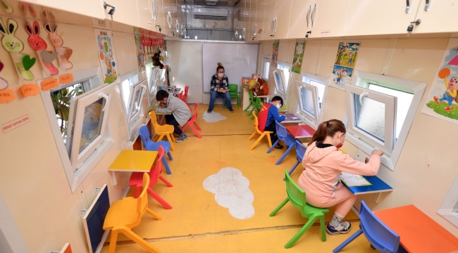 İzmir Büyükşehir Belediyesi tüm imkanlarını depremden etkilenen İzmirli yurttaşlar için seferber etmeye devam ediyor. Aşık Veysel Rekreasyon Alanı’ndaki çadır kente Gezici Çocuk Dünyası tırı kuran Büyükşehir çocuklara eğitsel faaliyetlerle beraber psikolojik destek de veriyor. İzmir Büyükşehir Belediyesi Sosyal Projeler Dairesi Başkanlığı’na bağlı olarak çalışan ve Gezici Çocuk Dünyası tırında görev yapan çocuk gelişim öğretmeni Zeliha Uçan, “Burada çocuklarla oyun oynuyoruz, şarkı söylüyoruz. Resim boyama, hikaye kitaplarımız, oyuncaklarımız geldi. Üç çocuk gelişim öğretmeni, bir psikolog görev yapıyor. Çok talep var, dönüşümlü olarak biz her çocuğa ulaşmaya çalışıyoruz” dedi. Her türlü pandemi önleminin de alındığını söyleyen Uçan, &ldqu o;Burası 20-25 çocuk kapasiteli ama biz bir defada içeriye 10 çocuk alıyoruz. Girerken galoş giydiriyoruz. Ateşlerini ölçüyoruz. İçerisini sürekli dezenfekte ediyoruz. Zor bir dönemden geçiyoruz ama önceliğimiz sağlık olduğu için her türlü önlemi alıyoruz” şeklinde konuştu.