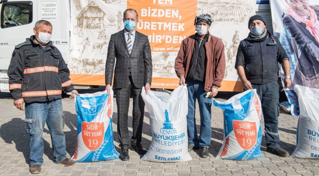 EGEOLAY/İzmir Büyükşehir Belediyesi büyükbaş hayvan yetiştiricilerine yem desteğini Kınık’tan sonra Aliağa, Buca ve Bornova ile sürdürüyor. Üç ilçede 27 üreticiye 15 ton süt yemi dağıtıldı.