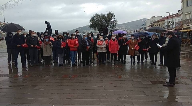 Foça Demokrasi Meydanı civarındaki parti binası önünde yapılan basın açıklamasına CHP Foça İlçe Başkanı Ayla Yılmaz, yönetim kurulu, kadın ve gençlik kolları üyeleri ile partililer katıldı. Yağmur altında gerçekleştirilen açıklamaları CHP Foça İlçe Başkanı Ayla Yılmaz ve Gençlik Kolları Başkanı Caner Aktan okudu.