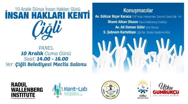 Çigli Belediyesi'nin öncülüğünde Raoul Wallenberg Enstitüsü, İzmir Barosu ve Kentsel Stratejiler ve Yerel Uygulamalar Derneği'nin katkılarıyla düzenlenecek "İnsan Hakları Kenti Çiğli" paneli, 10 Aralık Cuma günü (yarın) saat 14:00'de Çiğli Belediyesi Meclis Salonu'nda gerçekleştirilecek. Panele, CHP İnsan Haklarından Sorumlu Genel Başkan Yardımcısı Av. Gülizar Biçer Karaca, Raoul Wallenberg Enstitüsü sorumlusu İlhami Alkan Olsson, İzmir Barosundan Av. Ali Deman Güler ve Çiğli Belediyesi Strateji Geliştirme Müdürü Şebnem Kartaltepe konuşmacı olarak katılacak.
