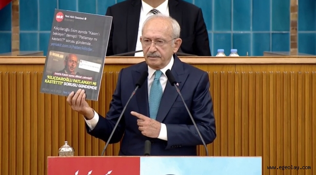 EGEOLAY/TBMM CHP Grup Toplantısında haftalık sunuş konuşmasını gerçekleştiren Cumhuriyet Halk Partisi Genel Başkanı Kemal Kılıçdaroğlu, "Kasım ayını bekleyin" paylaşımının Yeni Akit gazetesi tarafından İstiklal Caddesi'ndeki bombalı saldırıyla ilişkilendirilmesine sert tepki gösterdi. Gazetenin Twitter hesabından yaptığı paylaşımın fotoğrafını gösteren CHP Genel Başkanı Kemal Kılıçdaroğlu, “Bu yalanlarınızın, bu hedef göstermenizin, beş para etmez dilinizin hesabını sormazsam namerdim, hesabını soracağım” dedi.