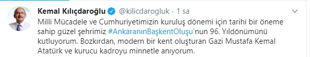 Milli Mücadele ve Cumhuriyetimizin kuruluş dönemi için tarihi bir öneme sahip güzel şehrimiz Ankara'nın Başkent Oluşu’nun 96. Yıldönümünü kutluyorum. Bozkırdan, modern bir kent oluşturan Gazi Mustafa Kemal Atatürk ve kurucu kadroyu minnetle anıyorum.