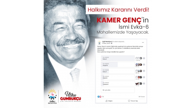 Başkan Gümrükçü’nün çağrısına en çok yorumun yapıldığı Ataşehir, Atatürk, Evka-5, Evka-6 ve Yakakent Mahalleleri arasında anket yapıldı. Çiğli Belediyesi’nin resmi sosyal medya hesapları üzerinden yapılan ankete katılanların büyük çoğunluğu, Kamer Genç’in isminin verileceği parkın Evka-6 Mahallesi’nde yapılması doğrultusunda oy kullandı. Göreve gelirken Çiğli’yi,Çiğlililer ile birlikte yöneteceğinin sözünü veren Başkan Gümrükçü, bu hareketiyle yapılacak parkın yerini vatandaşlara soran ilk Belediye Başkanı oldu.