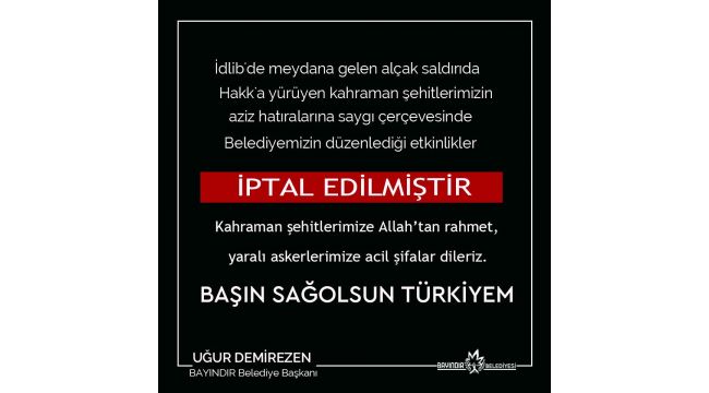 EGEOLAY /Bayındır Belediye Başkanı Uğur Demirezen, 27.02.2020 Perşembe gecesi Suriye’de gerçekleşen hain saldırı sonucu kaybettiğimiz şehitlerimiz için bir taziye mesajı yayınladı.