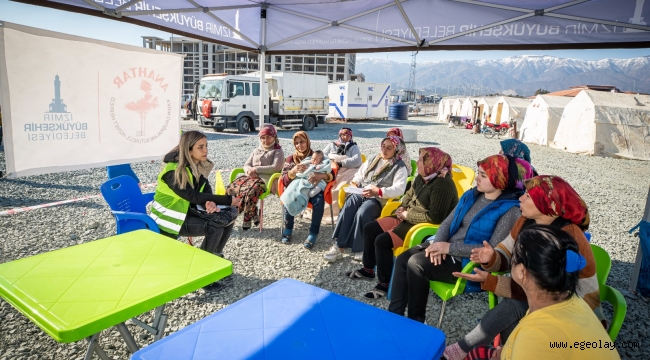 İzmir Büyükşehir Belediyesi ilki Hatay’da kurulan ve binin üzerinde depremzedenin kaldığı çadır kentte barınma, yemek, yardım ve sağlık hizmetlerinin yanı sıra sosyal ve psikolojik destek de sunuyor. Depremzedelerin travma sürecini daha rahat atlatabilmesi için “Psikososyal Destek Ağı” projesini başlatan İzmir Büyükşehir Belediyesi, çadır kentte görev yapan psikolog ve sosyologlar aracılığıyla depremzedelere ulaşıyor. Çocuklar için Masal Evi’nin hizmet vermeye başladığı çadır kentte ANAHTAR Kadın Çalışmaları Bütüncül Hizmet Merkezi personeli de kadınlara yönelik çalışmalar yapıyor.