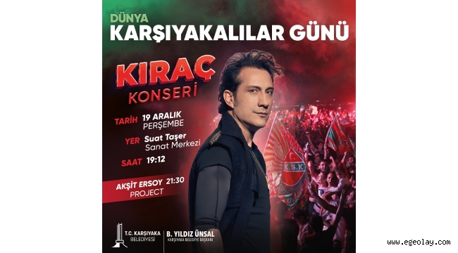 EGEOLAY/Karşıyaka sevdalıları tarafından ‘Dünya Karşıyakalılar Günü’ olarak kutlanan 19 Aralık, bu yıl ünlü sanatçı Kıraç’ın konseriyle muhteşem bir coşkuya sahne olacak. Karşıyaka Belediyesi’nin ücretsiz olarak düzenleyeceği büyük buluşma, Suat Taşer Sanat Merkezi’nde, 19 Aralık Perşembe günü saat 19.12’de başlayacak. Başkan Yıldız Ünsal “Yüreği Karşıyaka sevdasıyla çarpan herkesi, bu anlamlı günü birlikte kutlamaya çağırıyoruz” dedi.