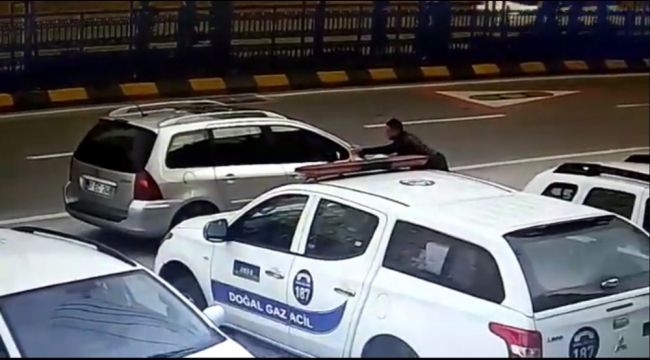 Trabzon'un Ortahisar ilçesinde marketten alışveriş yapmak için aracından inen şoför el frenini çekmeyi unutunca Yavuz Bayraktar isimli şahıs arabayı durdurmak için önüne geçti. Bayraktar'ın mücadelesi anbean kaydedildi.