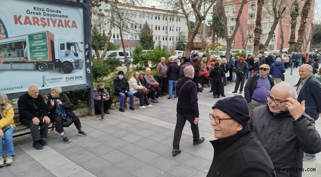 Perişan durumda olduklarını ifade eden emekliler, kuyruktakilerin yaş ortalamasının 75 ve üzeri olduğunu vurgulayarak, bu şekilde beklemeyi hak etmediklerini dile getirdi. Ayrıca, Karşıyaka Belediyesi'nden kuyruğun olduğu alana bank koyulmasını talep ettiler.