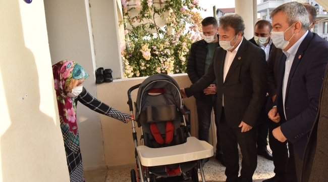 Engelliler Günü kapsamında ortopedik engelleri bulunan 3 bebeğe ortopedik puset hediye edilirken, 3 vatandaşa da akülü sandalye bağışında bulunuldu. Bebeklerin pusetlerini Bornova Belediye Başkanı Dr. Mustafa İduğ, Bornova Kızılay Başkanı Cemil Kurkut ile birlikte teslim etti.