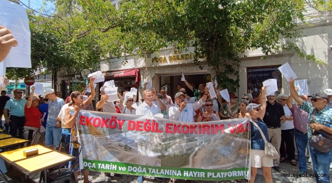 EGEOLAY/İzmir’in Foça İlçesi’nde çevreciler ekolojik tarım amaçlı denilerek başlatılan Ekoköy projesinin iptali için eylem ve basın açıklaması yaptılar. İnşaat alanında başlayan eylem ilçe merkezinde Foça Belediyesi önünde devam etti. Ekoköy inşaat ruhsatlarının iptali için 4 bin kişinin imzaladığı dilekçe sloganlar atılarak Foça Belediyesi’ne teslim edildi.