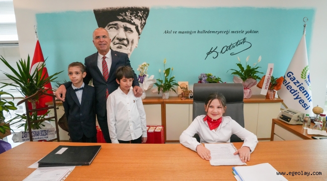 Gaziemir Belediye Başkanı Ünal Işık, 23 Nisan Ulusal Egemenlik ve Çocuk Bayramı nedeniyle koltuğunu üç öğrenciye bıraktı. İlkokul 4. sınıf öğrencileri Alya Su Gücün, Ahmet Deniz Faraş ve Aybars Tuna Kurnaz sırayla belediye başkanlığı koltuğuna oturdu.