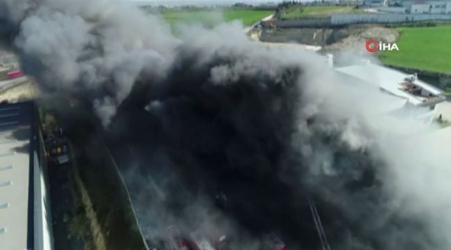 Fabrikadan yükselen dumanlar adeta gökyüzünü kaplardı. İtfaiye ekiplerinin müdahalesi sürerken gökyüzünü kaplayan dumanlar ve itfaiye ekiplerinin müdahalesi havadan görüntülendi.