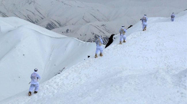 Irak sınırındaki Seriberi Üs Bölgesi'nde çıkan çatışmada 4 kahraman askerin şehit olmasının ardından tüm sınır hattındaki Mehmetçik alarm durumuna geçti. Olası hain bir saldırıya karşı elleri tetikte bekleyen kahraman askerler, metrelerce kar yığını arasında çalışmalarını yürütüyor. Giydikleri kar tipi kıyafetlerle hem vücut sıcaklıklarını koruyan hem de arazide adeta görünmez olan Mehmetçik, faaliyetlerini sorunuz sona erdirerek daha sonra güvenle üsse dönüp bir sonraki göreve hazırlanıyor.