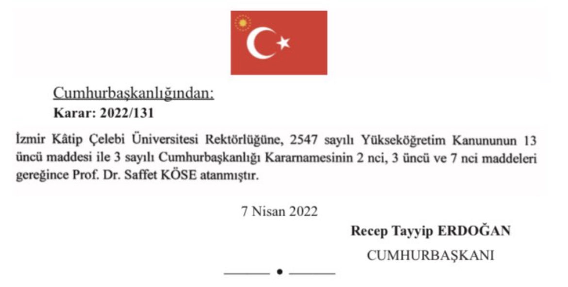 EGEOLAY/Resmi Gazete'de yayımlanan Cumhurbaşkanlığı Atama Kararıyla İzmir Katip Çelebi Üniversitesi Rektörlüğüne Prof. Dr. Saffet Köse atandı.