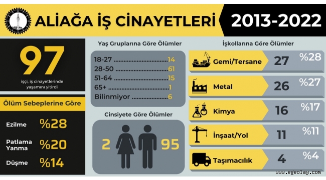 İSİG Meclisi verilerine göre, Aliağa'da 2013 yılı ile Temmuz 2022 arasında yaşanan işçi ölümlerinin işkollarına göre dağılımı şöyle: Gemi, tersane, deniz, liman işkolunda 27 işçi; metal işkolunda 26 işçi; petro-kimya, lastik işkolunda 15 işçi; inşaat, yol işkolunda 12 işçi; taşımacılık işkolunda dört işçi; tarım, orman işkolunda iki emekçi; ağaç, kâğıt işkolunda iki işçi; ticaret, büro, eğitim, sinema işkolunda iki emekçi; sağlık, sosyal hizmetler işkolunda iki işçi; belediye, genel işler işkolunda iki işçi; madencilik işkolunda bir işçi; çimento, toprak, cam işkolunda bir işçi; enerji işkolunda bir işçi hayatını kaybetti.