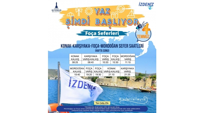 İzmir Büyükşehir Belediyesi İZDENİZ Genel Müdürlüğü’nün artık klasikleşen yaz seferleri, 4 Temmuz Cumartesi gününden itibaren başlayacak. Seferler, hafta sonları; Karşıyaka-Konak-Güzelbahçe-Urla; Karşıyaka-Konak-Mordoğan-Foça ve Konak-Karşıyaka-Foça-Mordoğan güzergâhlarında yapılacak.