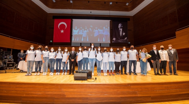Arıcan’ın ardından Başkan Soyer, Büyük Kadınlar Türkiye Kupası Şampiyonu olan İzmir Büyükşehir Belediyesi Su Topu Kadın Takımı’nı sahneye davet etti. Başkan Soyer, İzmir Büyükşehir Belediyesi Gençlik ve Spor Kulübü’nün kısa süre önce faaliyetlerine başlayan su topu şubesinin iki ayda yedi kupa kazandığını ve milli takımlarımıza onlarca oyuncu gönderme başarısı gösterdiği bilgisini vererek sporcuları teker teker tebrik etti.