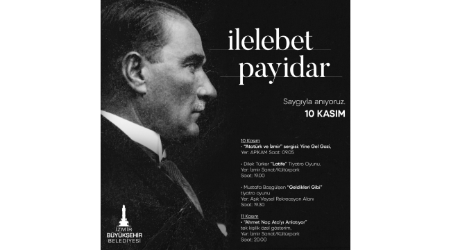 EGEOLAY/Ulu önder Mustafa Kemal Atatürk’ün 82’inci ölüm yıldönümü nedeniyle İzmir Büyükşehir Belediyesi tarafından bir dizi anma etkinliği düzenlenecek. Atatürk’ün İzmir günlerini anlatan “Yine Gel Gazi” başlıklı serginin yanı sıra, İzmir Sanat ve Aşık Veysel Rekreasyon Alanı’nda tiyatro gösterileri sahnelenecek.