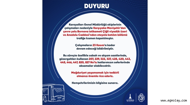 “Karşıyaka Mavişehir'den çevre yolu Bornova istikameti Çiğli viyadük üzeri ve Anadolu Caddesi'nden otoyola katılım bölümü trafiğe kısmen kapatılmıştır. Karşıyaka Yalı Caddesi, Anadolu Caddesi ve Altınyol’u kullanan Karşıyaka İskele, Bostanlı İskele, Menemen, Egekent2, Halkapınar Aktarma Merkezi kalkışlı 207, 229, 322, 327, 428, 429, 443, 445, 446, 447, 820 ve 827 No’lu otobüs hatlarımızın seferlerinde bu nedenle gecikmeler yaşanmaktadır. Bölgede ayrıca Çiğli Tramvayı’nın seferlerinde de aksamalar olabilmektedir. Buradaki çalışmaların 23 Kasım'a kadar devam edeceği bildirilmiştir.
