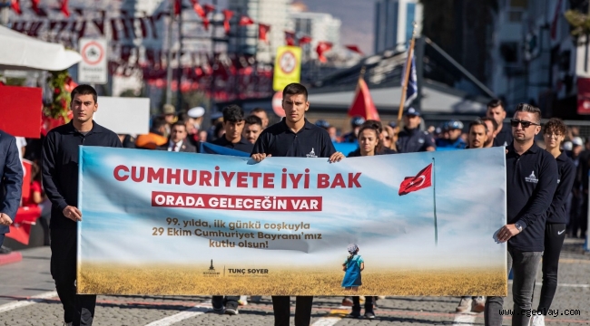 İzmirliler ise bayram coşkusuna ortak olmak için Cumhuriyet Meydanı’nda buluştu. Vali Köşger, Korgeneral Yeni ve Başkan Soyer, askeri araçla tören alanından halkı selamladı. Okullardan meslek odalarına ve sivil toplum kuruluşlarına kadar her gruptan katılımın olduğu geçit töreninde İzmir Büyükşehir Belediyesi’nin birimleri de yer aldı. Her yaştan İzmirlinin katıldığı törende Karşıyaka Halk Eğitim Merkezi Egem Derneği’nin halk oyunları gösterisi büyük ilgi topladı. Şehit Ömer Halisdemir Anadolu İmam Hitap Lisesi öğrencisi Esmanur Değmiş’in okuduğu “Mustafa Kemal’in Kağnısı”,  Şehit Ömer Halisdemir Anadolu Lisesi öğrencisi Ravza Top’un okuduğu “Akdeniz’e Doğru” şiirleri alkış aldı.