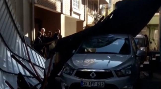 Ege Bölgesi'nde etkili olan fırtına İzmir'de hayatı olumsuz etkilerken, fırtınanın şiddetiyle ağaçlar yerinden söküldü, binaların çatıları uçtu.
