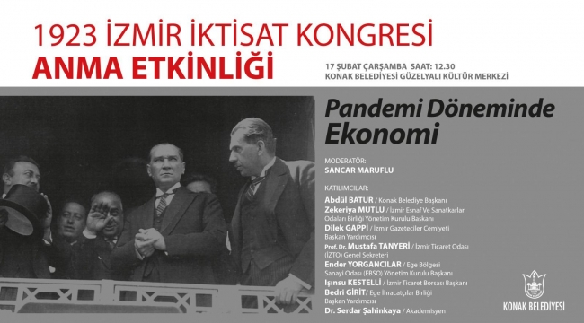17 Şubat 1923 yılında düzenlenen İzmir İktisat Kongresi’nin yıldönümlerinde anma etkinliği düzenleyen Konak Belediyesi bu yıl da geleneğini bozmadı. Kongrenin 98. yıldönümü, Konak Belediyesi Güzelyalı Kültür Merkezi’nde 17 Şubat’ta düzenlenecek ve saat 12.30’da başlayacak özel bir oturumla kutlanacak. Pandemi döneminde ekonomi konusunun ele alınacağı etkinlik, çok önemli konuşmacıları da bir arada getirecek. Moderatörlüğünü İzmir’in simge isimlerinden Gazeteci, Yazar Sancar Maruflu’nun yapacağı etkinlikte Konak Belediye Başkanı Abdül Batur, İzmir Esnaf ve Sanatkarlar Odaları Birliği Yönetim Kurulu Başkanı Zekeriya Mutlu, İzmir Gazeteciler Cemiyeti Başkan Yardımcısı Dilek Gappi, İzmir Ticaret Odası (İZTO) Genel Sekreteri Prof. Dr. Mustafa Tanyeri, Ege Bölgesi Sanayi Odası (EBSO) Yönetim Kurulu Başkanı Ender Yorgancılar, İzmir Ticaret Borsası Başkanı Işınsu Kestelli, Ege İhracatçılar Birliği Başkan Yardımcısı Bedri Girit ve Akademisyen Dr. Serdar Şahinkaya birer konuşma yapacak.